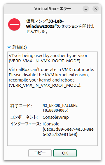 Ubuntu上にインストールしたVirtualBox上にある仮想マシンの起動を試みたところ、こうである。